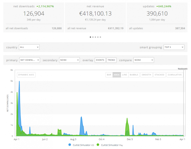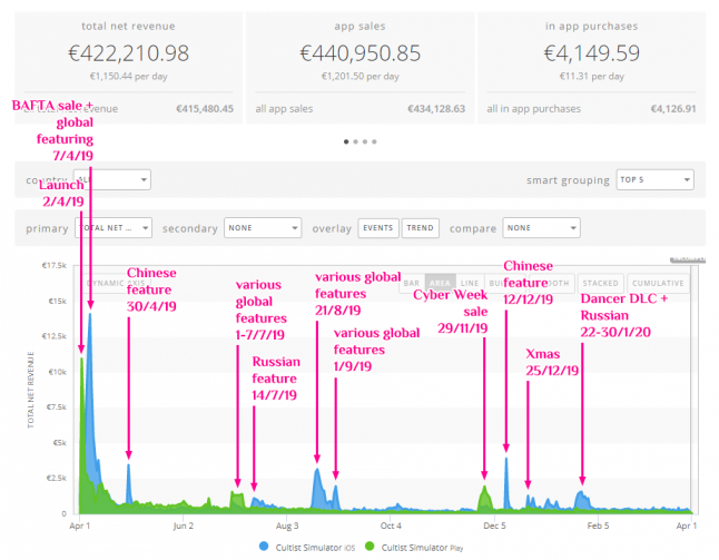 In one year on sale, we've made €422k net revenue. This is more than double what we made in our first two months, which I'm surprised by. I'd always assumed premium mobile games made all their money at launch, and then trailed off into insignificance over time. Not anymore.