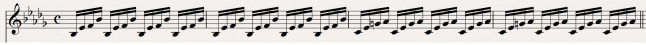 First, let's look at what the harp is doing. It's playing 2 specific note patterns, on repeat---each ascending arpeggios of 4 notes, for 4 measures: