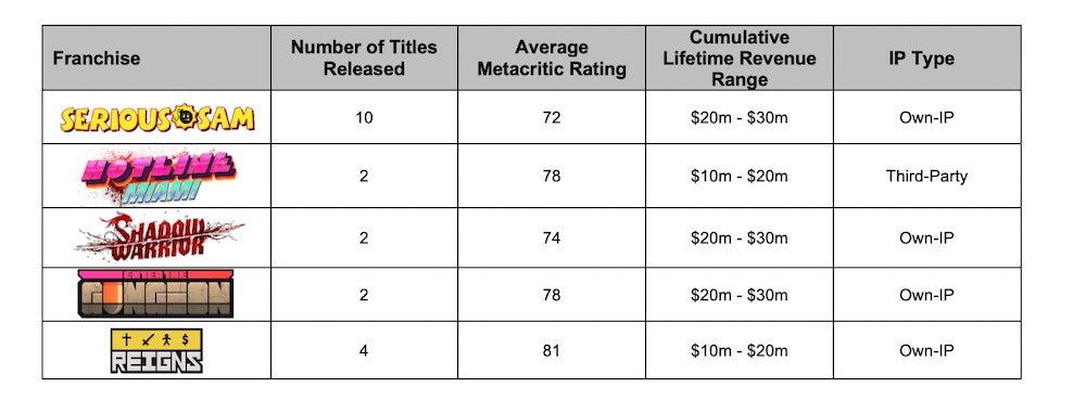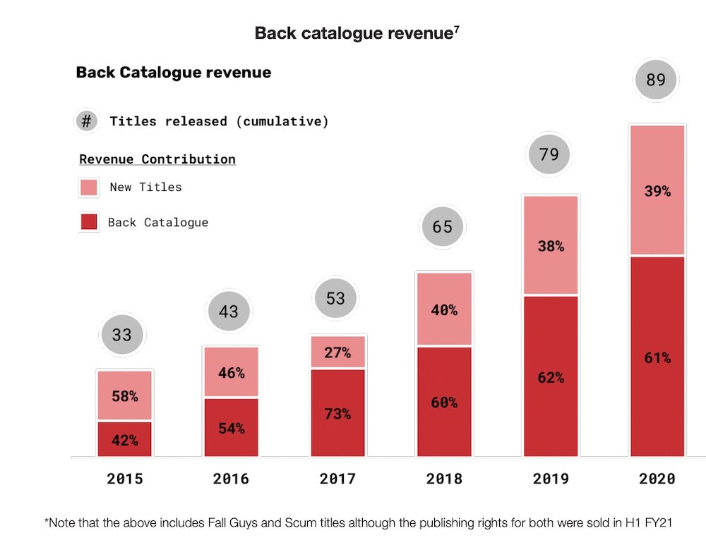 And luckily, the excess profit generated by Fall Guys - $70 million in 2020 alone - allowed the company to buy Croteam (Serious Sam), Nerial (Reigns), Firefly Studios (Stronghold) and Dodge Roll (Enter The Gungeon) - as well as publisher Good Shepherd. Which leads to the above figure, showing the company’s multi-title franchises, and which can be classed ‘own IP’*.
