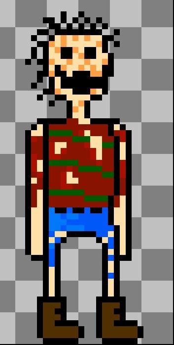 While he is your standard "pig butcher slasher", I really like his cameo in Shotgun. Shotgun is an action game, and Porksy has taken a lot of people by surprise when you enter his lair. The tone of the game immediately shifts from survival to horror. He jumps at unsuspecting players from out of a room, squealing like a pig and revving his chainsaw. He also takes many more shots to bring down compared to your regular coke-sniffing punk. Venturing further you can uncover exactly what he was doing in the basement, and come face to face with one of his previous victims.