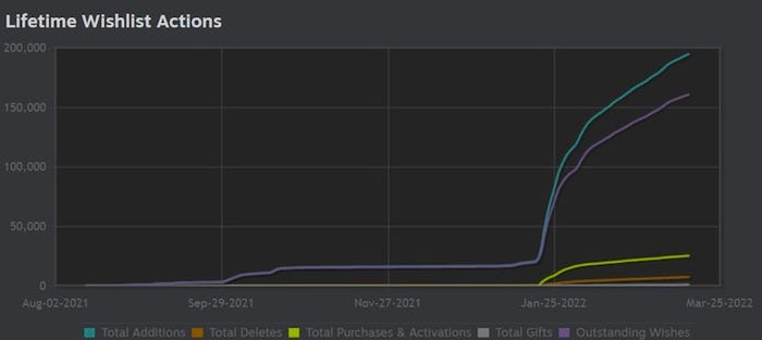 The game was sitting at around 20,000 Steam wishlists at launch. But what’s been really impressive is its first-week results (about 5x as good as median, according to our Plus data), and its long term sales. It’s now the 18th best performing new January 2022 title by total Steam reviews to date - which is great for such a small title.