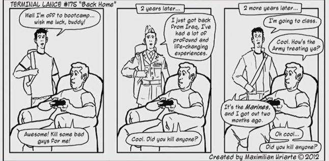 Over the years I’ve found a huge disconnect between the reality of war, and how it is portrayed in TV, films, and games. Here’s an example of what it can feel like talking to civilians about war: