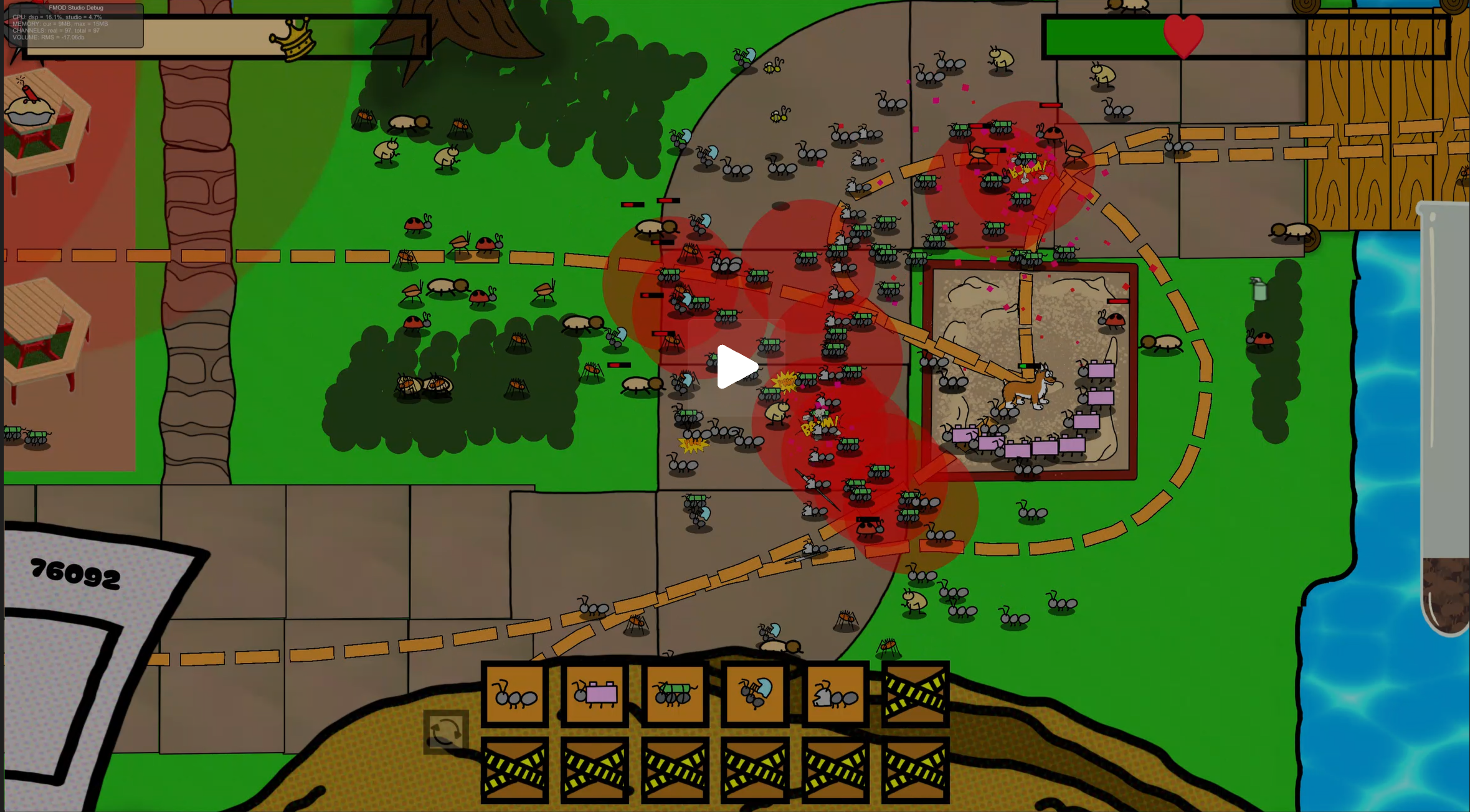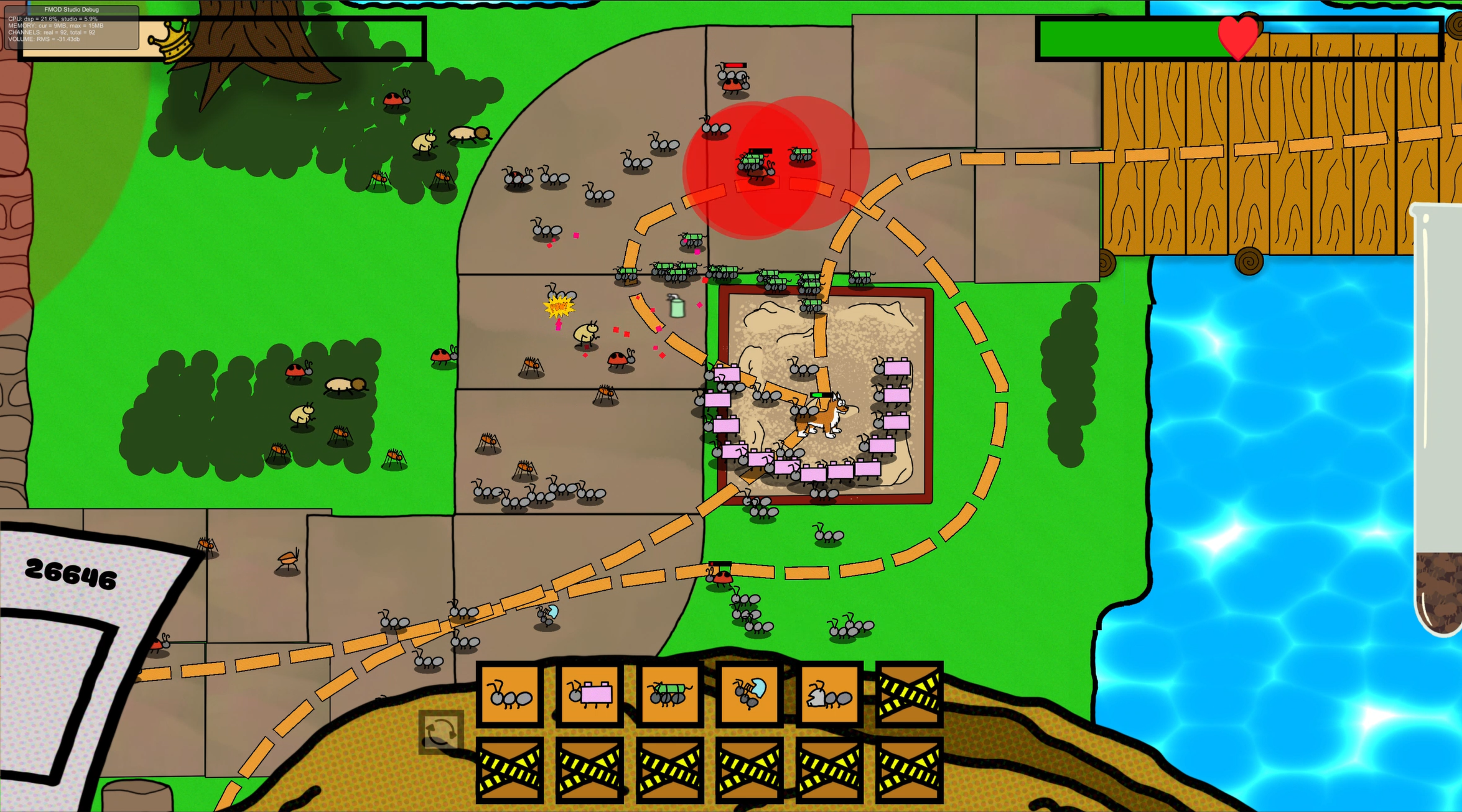 When it came to systems, luckily, only a little had to change from a traditional tower defense in terms of core systems; the idea of placing towers and having them attack automatically worked well. Meanwhile, the significant addition to enemies was cooldowns to their attacks, since once they got to the queen, they would attack it instead of getting to their destination and disappearing like a traditional tower defense game. They also needed to have more advanced movement AI to track the queen. Another of the most significant changes is what the towers and enemies focus on; while you have your standard stuff like primary attackers, explosive users, status effect givers, etc, this game has many enemies and towers focused on disruption compared to normal.