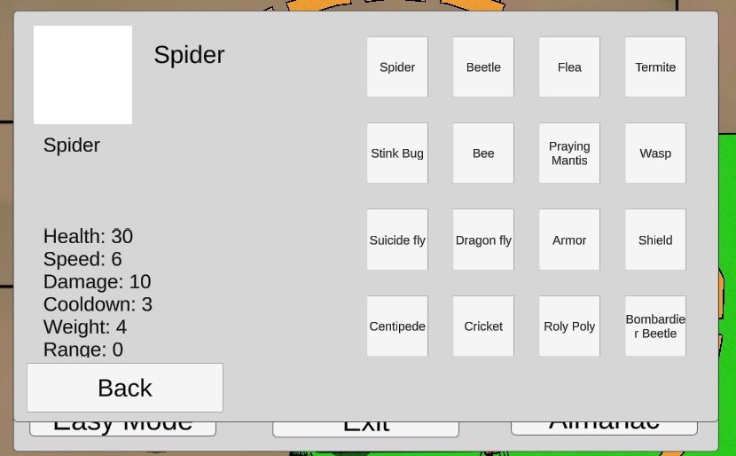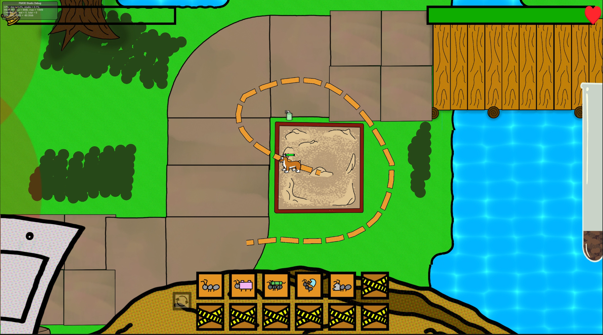 In terms of ants, 4 of the 12 have ways to mess with enemies in some way, while 5 of 16 enemies have ways to disrupt the ants attacking them. The main reason for this is due to the level design. With how big the levels are, it is essential to make ants that allow the player to manipulate the enemies in beneficial ways. For example, some ants push enemies back, potentially into things that could kill them, like water, or some ants block paths and force enemies to go around. Meanwhile, enemies that disrupt ants were made to prevent boring strategies. For example, I brought up ants that block paths; if they had no way to be dealt with, then most enemies would be easy to deal with; just block all their paths. To deal with this, the termite enemy can eat through them, or the cricket enemy can lure them away (not pictured).