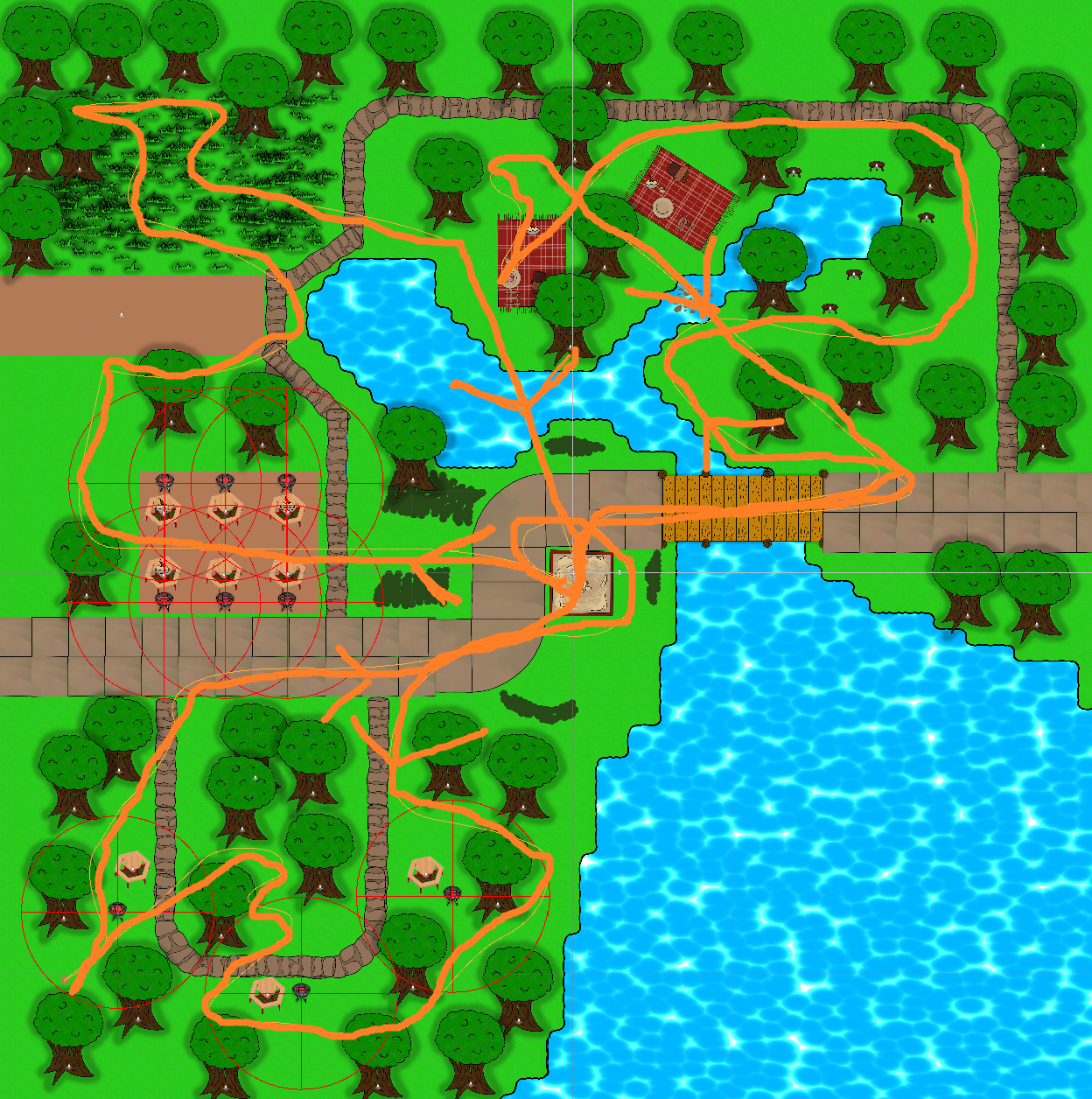 Unlike regular tower defense games, where pathing is a simple “stop the enemy before they get from their spawn to the goal,” our game’s pathing is based on an animal or an object; for this example, let’s use the Corgi Queen. Because the path is based on a corgi, it must be designed as if a corgi is moving through the level. This corgi isn’t smart; it’s just a corgi living and doing what it would do: playing, eating, smelling, exploring, etc. Because of this, pathing isn’t just setting up a bunch of waypoints. It’s also a story: what is the corgi doing at all these points? Why does the corgi go on such an odd path to the end instead of straight there? Does it make sense in the level? You also have to consider stuff like Does it speed up? Stop? Etc. Despite how hard it might sound, I find this the easiest and quickest part since you usually come up with the story during the grey boxing them.