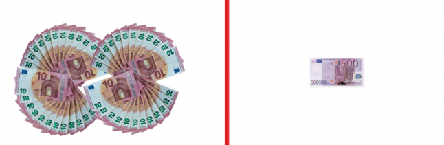 The pile of bills on the left seems at first glance more valuable than the bill alone on the right.