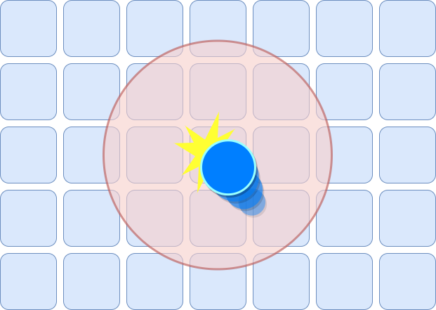 When the ball hits a brick or the front wall, a circle is generated (the explosion) and all bricks inside a radius starting from the impact point are detected