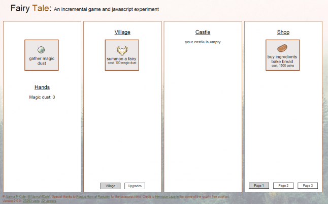 I released my first videogame in June 2015. Fairy Tale is an experimental incremental game that I designed to teach myself Javascript. This game was a creation of love and learning, and I never expected anything to come of it. I poured myself into Fairy Tale, coding in every free moment that I had for months before finally deciding the prototype was ready to be released.