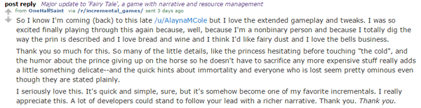 In addition to this, another player of Fairy Tale noticed the non-binary characters and wrote me a beautiful comment about their experience with the game.