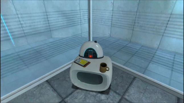 This song is interrupted and we are presented with a new song, performed by the iconic turrets, for the character. At this very moment we're listening to the same thing Schell is.