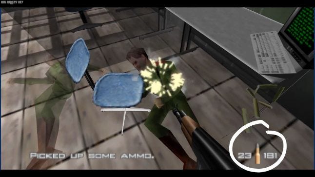 One of the first games I remember having several diegetic interface elements is the Nintendo 64 multiplayer favorite: Goldeneye 007.