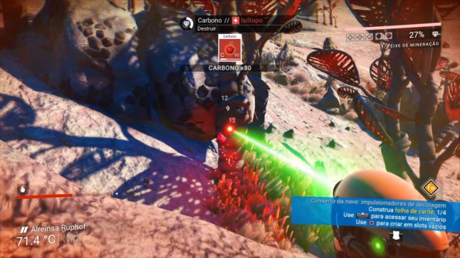 Similar to Half Life, all HUD elements in No Man's Sky such as the charge of your weapons, life support and weather-enduring systems are all diegetic, they are also acknowledged by the game and is actually displayed on the character's helmet. As soon as the player enters his ship, the panels are used to give information about speed, location and fuel, bringing the interface into the game's universe. No pun intended.