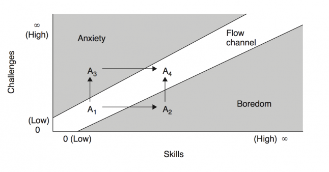 Fig 3. This chart from “Flow: The Psychology of Optimal Experience” shows how the Flow channel works. If the challenge is much bigger for the player, we will generate anxiety on him/her. But if it is perceived as simple for the user skills, he/her will get bored.