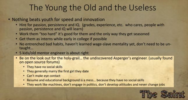 In the ensuing outrage, a PowerPoint presentation written by St. John surfaced which included a slide in which he referred to engineers with Asperger syndrome as being "the holy grail" of hires. "They work like machines," he wrote, "don’t engage in politics, don’t develop attitudes and never change jobs."