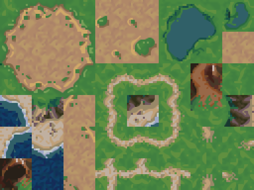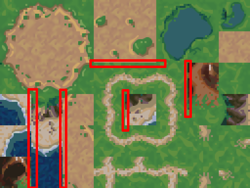 Well, not exactly. You see, upscalers look at neighboring pixels to decide how to draw things at a higher size. And when a tilesheet is all compacted like this, tiles inevitably get placed next to ones that they would never border in the actual game, yet those "false neighbors" will influence how the upscaled tile gets drawn. I've highlighted a few such locations below: