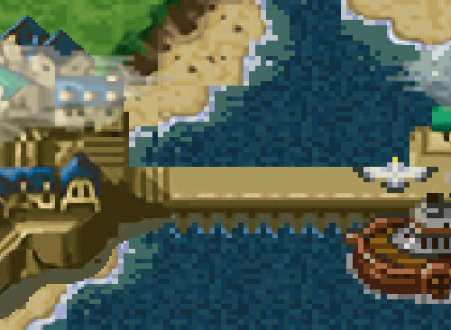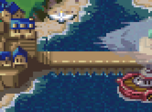 Some elements are fully pixelated (the boat, the seagulls), some have an upscale filter applied (the houses in the village), and some are pixelated with a bilinear filter slapped on top (the clouds, which are transparent to boot). To top it off, scaling is inconsistently applied at a non 1:1 ratio - at 1080p resolution, the boat features pixels variably scaled at 7x5, 6x5, and 5x5.