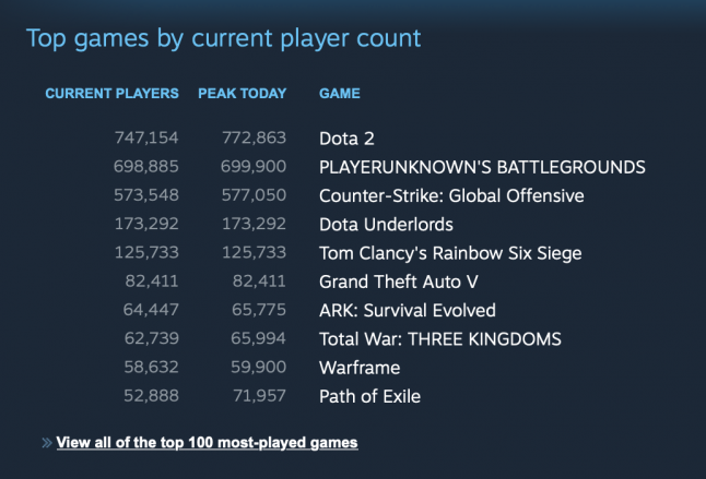 Sitting directly above it in third place is Counter-Strike: Global Offensive with 577,050 concurrent users, while Playerunknown's Battlegrounds occupies second place with 699,900 concurrent users. Sitting at the very tippy top of the pile is Underlords' older cousin Dota 2, which has made the top spot its own with 772,863 concurrent users.