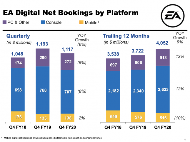 In terms of just digital net bookings, EA offers a closer look at exactly where those digital earnings came from during both the quarter and full year. For both periods, PC brought in the most digital net bookings with a total of $707 million for the quarter and $2.6 billion for the full year.
