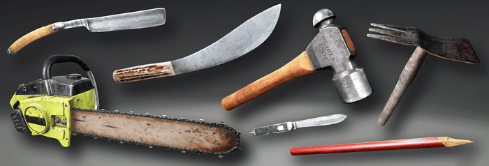 The weapons that can be found in the game. Each has a different attack speed, hit and impact. Is it a slice? Is it a slash? Does it leave an open or closed wound? How much does the wound bleed?