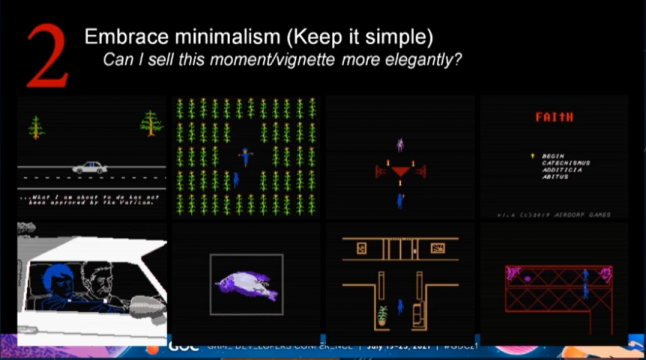 Smith said his second tool was to focus on keeping his games “simple.” “I have this ‘form-follow-function’ approach to the FAITH series. I firmly believe in having a consistent voice and executing on it. Can I sell a vignette or moment more elegantly?”