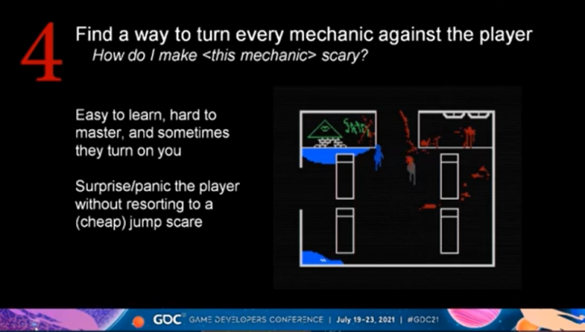 Smith described this rule in one simple phrase: “You can identify spaces that the player considers safe, and then you can invade that,’ he explained. He called out “save rooms,” unintrusive corridors, or even in the space where there just seem to be meaningless background objects.
