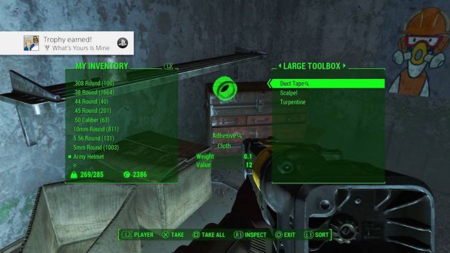 But my kidnapped son was going to come home to me. And when he came home, he wasn't going to be raised in a palace of garbage. Bethesda has also put special one-off versions of commonplace junk in the game, as well. If I was going to teach my son after I found him, he wasn't just going to have a broken Globe, he was going to have the Clean Globe. He wasn't going to just have a beat-up Baseball Glove. He was going to be the proud owner of the Youth League Baseball Glove, fresh from the Treasures of Jamaica Plains. I scavenged the Wasteland to build a warm home for my missing son.
