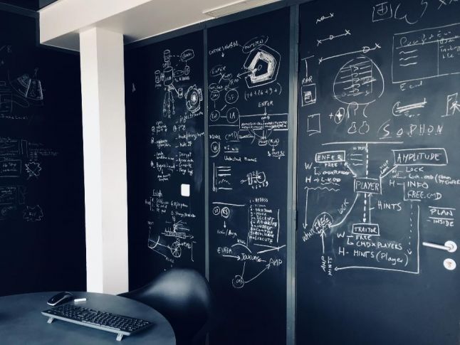 A wall in the office filled with the results of a Machiavellian brainstorm.