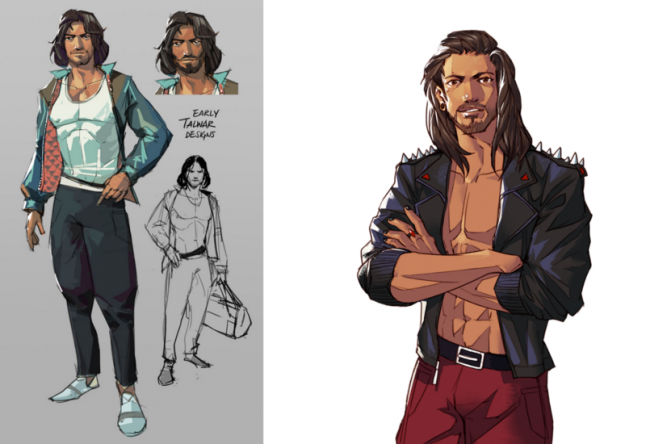 Sunder’s original character direction (left) was “attractive, long hair, a little shallow, owns a nightclub” and we knew he works out a lot, so we gave him gym attire. But this gave the impression that his primary character trait was going to the gym, and all the associations that came along with that.