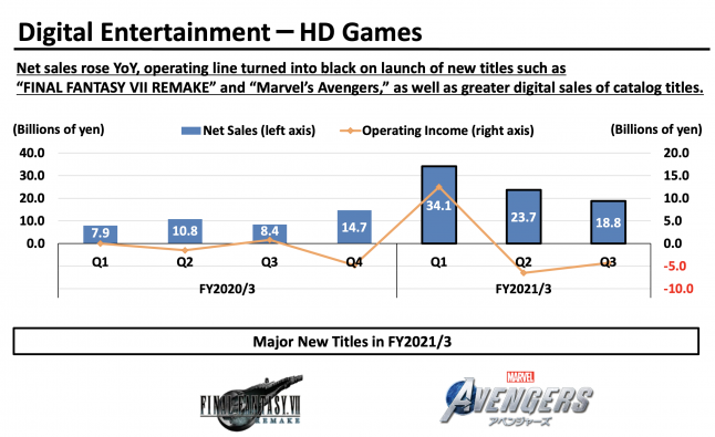 The company attributed that upswing to the release of "major titles" like Final Fantasy VII Remake and Marvel's Avengers, rising digital sales of catalog titles within its HD Games sub-segment (pictured below), and a "turn to profit at the operating line."