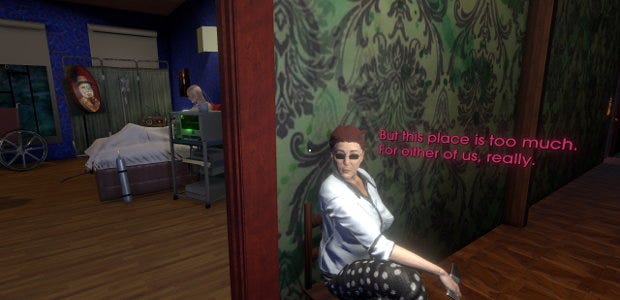 “As the game opens up, every completed action unlocks a new passage or points the player in a new direction, or revisits old directions from new angles," he says. "My intention with this is to constantly surprise the player, or keep them wondering what might be around the next corner. I try to avoid dead-ends. Every room has a button that offers a secret path to another part of the hotel, so the forward momentum of flow is constant. I reward backtracking by moving characters around at different points in the game, so that they meet one another and their conversations dynamically change depending on who they’re talking to.