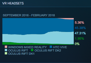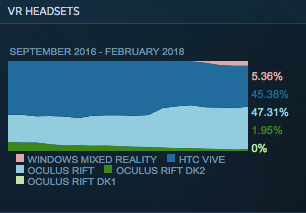 Overall, roughly .28 percent of reporting Steam users have VR headset plugged into their PC. Looking at Steam’s entire reporting userbase as a whole, the Rift is now used by .14 percent of users, up .02 percent from January, while the HTC Vive is used by .13 percent, up .01 percent from last month.