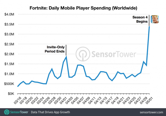 According to analytics outfit Sensor Tower, Epic Games' popular shooter was nudged past the $50 million mark following the launch of the game's fourth season of content.