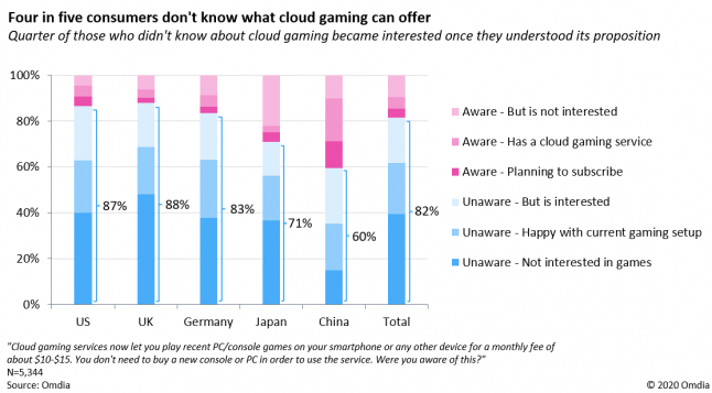 Omdia’s survey was conducted in November 2020 on desktop and mobile devices. 5,344 respondents in the US, UK, Germany, Japan and China were asked: "Cloud gaming services now let you play recent PC/console games on your smartphone or any other device for a monthly fee of about $10-$15. You don't need to buy a new console or PC in order to use the service. Were you aware of this?" Broad spectrum of age groups were surveyed, however results are not nationally representative.
