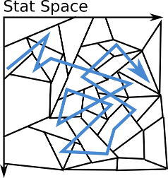 Much like above, a play-through is a linear path through a space of player and world stats. Ideally this path will touch a large proportion of the possible events exactly once. If it keeps coming to the same place, the story will be repetitive, and if it goes past most of the events without touching them, there's a lot of wasted effort.