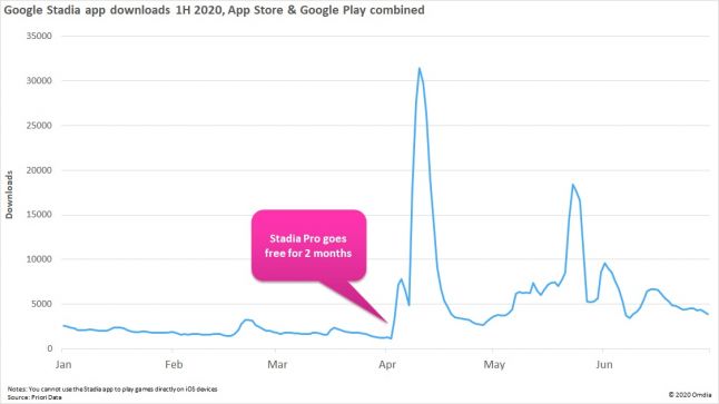 In March, the Stadia app was downloaded an average of 1,739 times per day across App Store and Google Play. After the free trial was introduced, according to Priori Data, daily downloads spiked at almost 32,000 – an increase of 1700%. However, the rate of installs quickly normalized, and now sits around pre-trial levels at less than 5,000 per day.