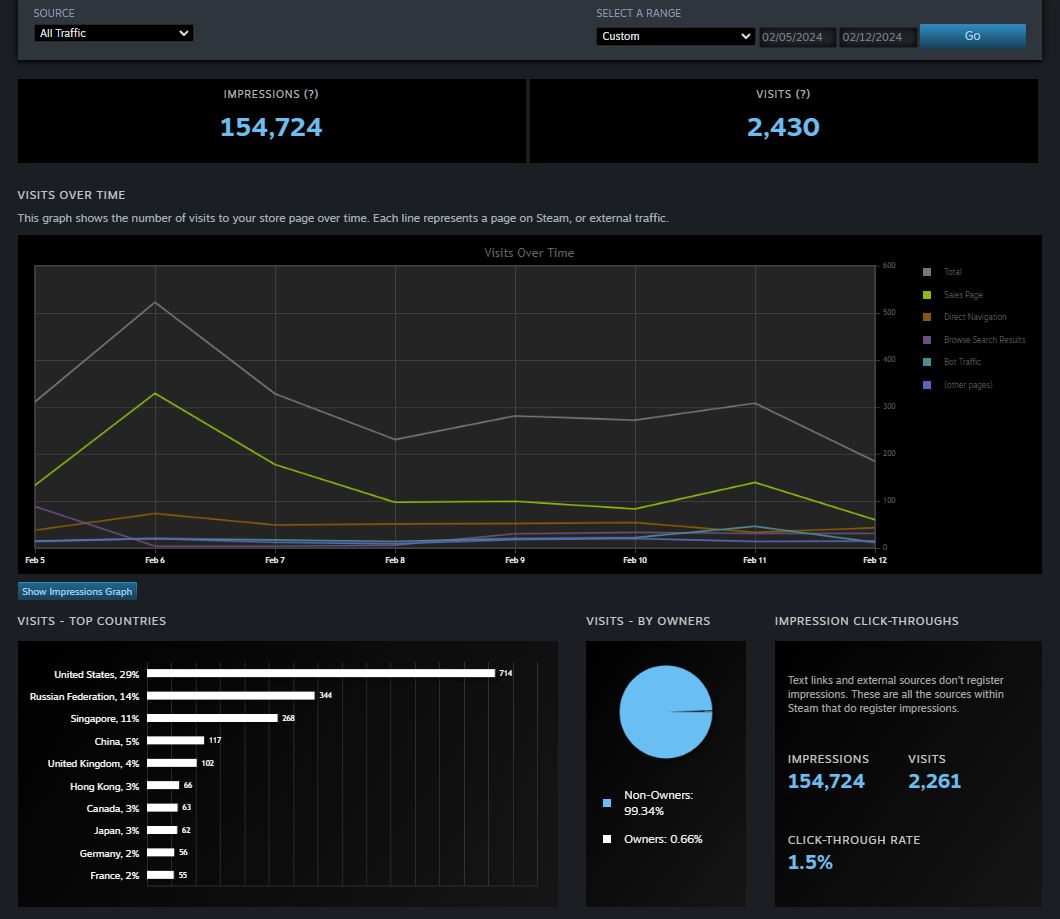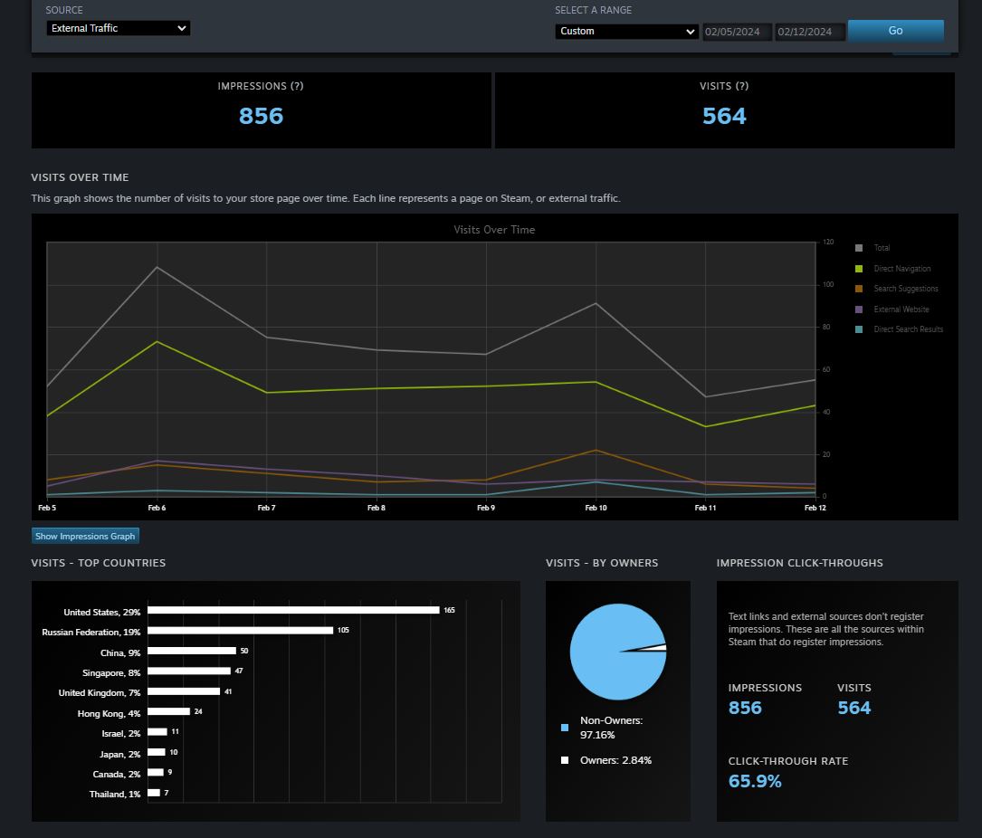 Of the 2,261 store visits 564 were from external traffic (Roughly a 5th from external traffic the rest were from within Steam)