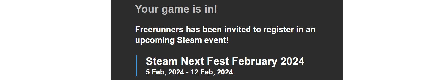 I first uploaded the demo to Steam in September 2023. The plan was to get the demo up early and then keep refining it until the Next Fest, giving plenty of time to iron out bugs, get feedback and act on that feedback. For uploading a demo to Steam and linking it to my main store page this YouTube video was very helpful. Funnily enough, I missed the deadline for applying for the Feb 2024 Next Fest. However, I contacted Steam a few days after the deadline, letting them know I was interested and they let me join it still (thanks Steam). I think having my storepage and demo already up probably helped me out there. So then that was it, I was locked in!