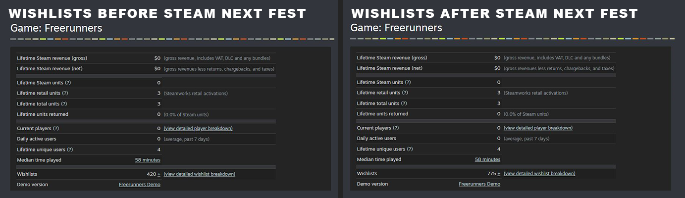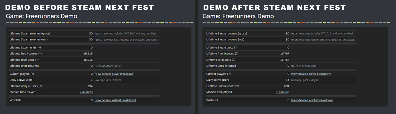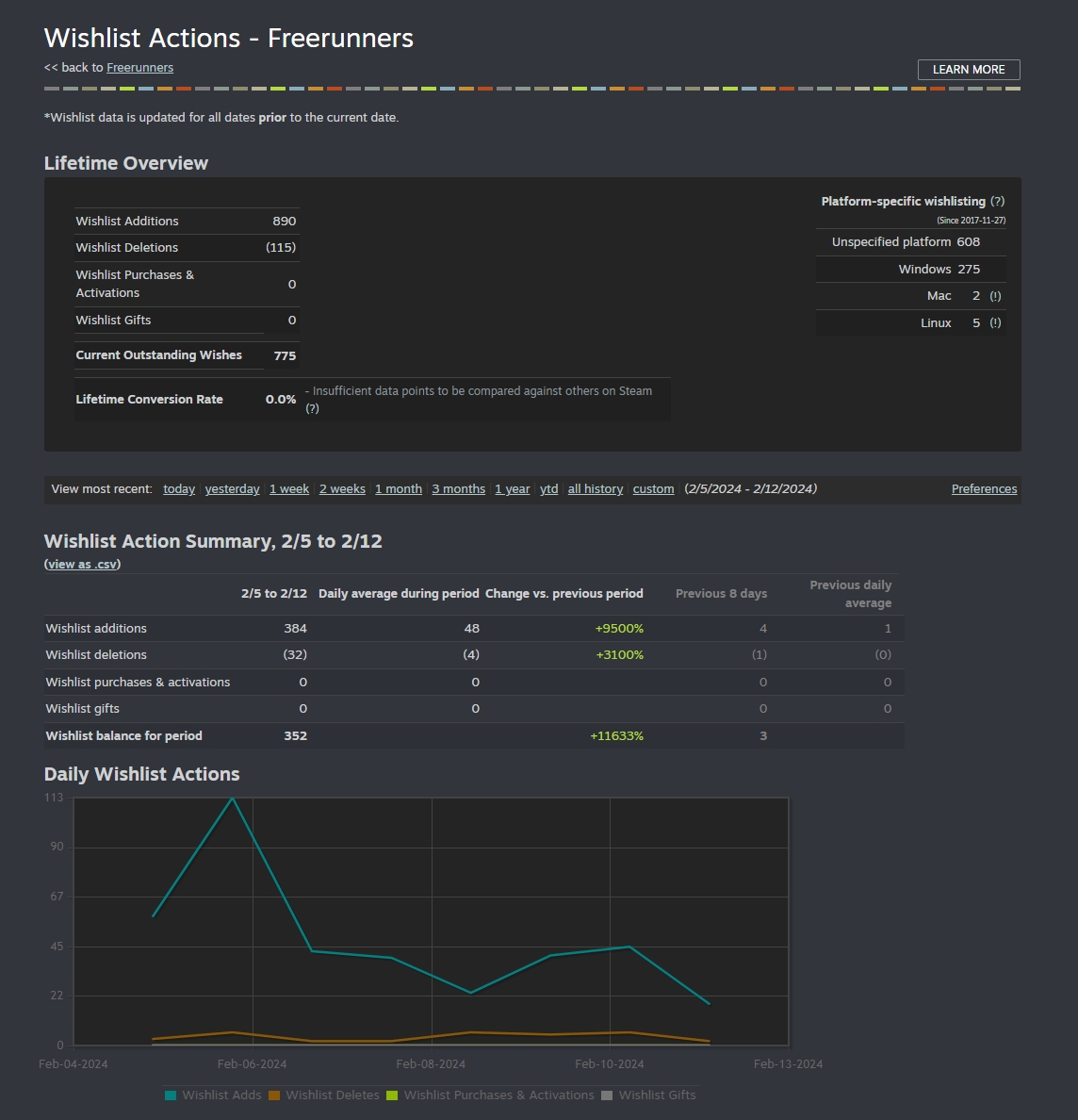 Let’s get to the bit you probably came here to see, the cold hard numbers! I could do the marketing clickbait thing and tell you that I almost doubled my wishlists! But before you get too excited the truth is the numbers weren’t great ha. But it’s been a good learning experience and something I can work and build on, both for Freerunners and games I make in the future!