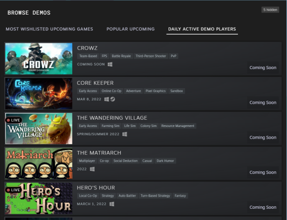 I created a discord server and released the demo. Despite a few bugs, most players were able to play and enjoy it so it was a big relief. It had around 1000 daily active users and was consistently in the top 20 demos with most players. When the festival started, The Matriarch was in the top 5 fest demos with most players.