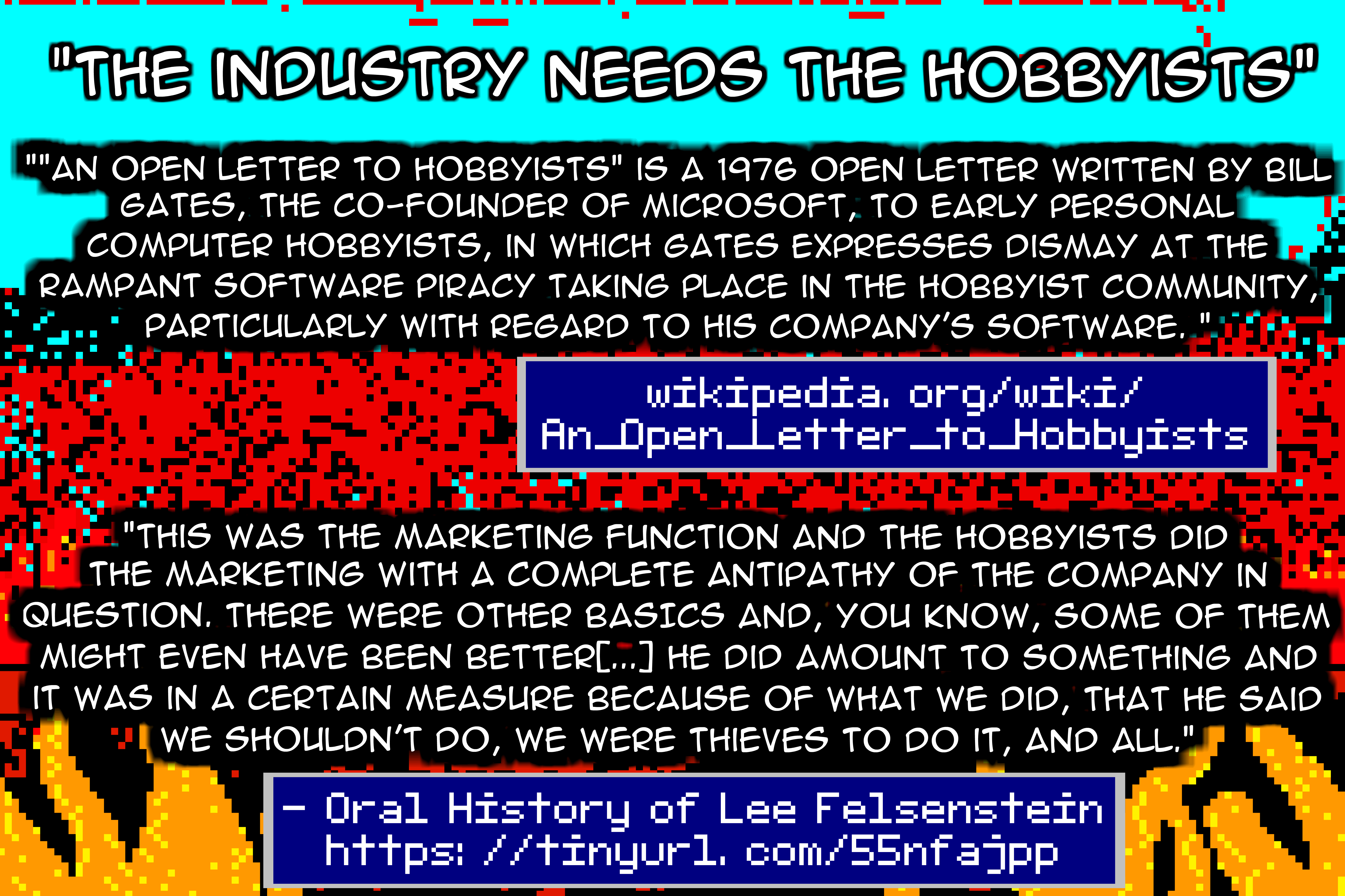 For example Bill Gate’s “An Open Letter to Hobbyists”, written in 1976, in which Gates expressed frustration with hobbyists who used his company’s software without paying for it. Then hobbyists responded by arguing that it was popular because of them.