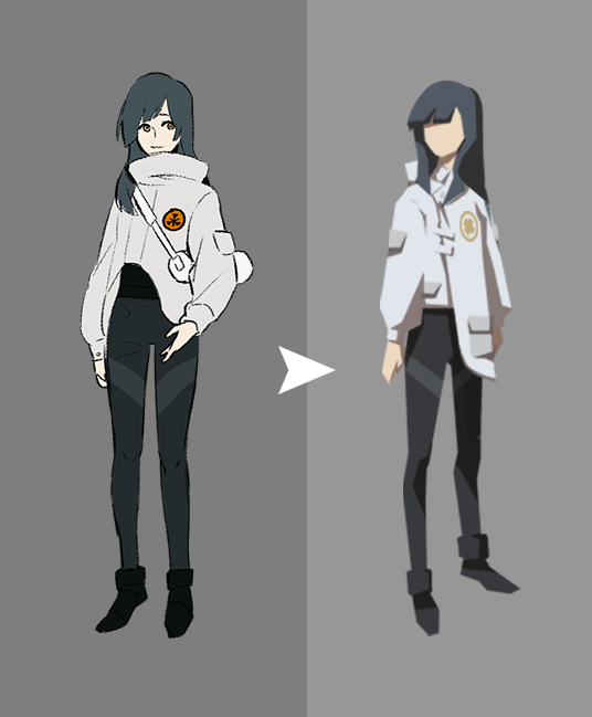 Research has shown that human vision prioritizes shapes. So we started with silhouettes when we moved on to visualizing our characters. Using the references we gathered, the goal is to create shapes that capture an Asian tech aesthetic.