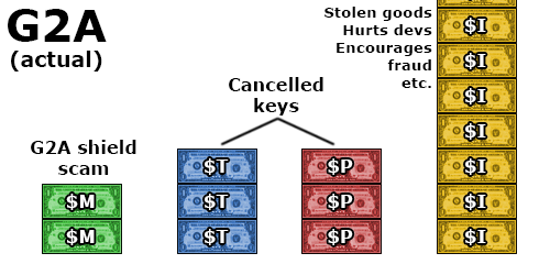 And what happens when you buy stolen goods? Sometimes the stores are able to track which keys have been fraudulently obtained, and they cancel them. So you just saved $10 by buying a game from G2A, but now your key's been revoked and you have nothing. Now G2A has defrauded you too! And no, they won't refund your money.