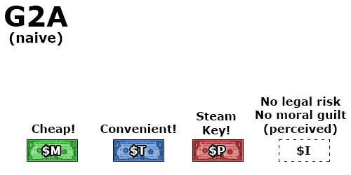 And this is precisely what makes G2A so insidious. The (relatively) high friction of piracy, and decades of demonizing industry propaganda against it, have given G2A a golden opportunity to masquerade as a store that outcompetes the legitimate service on all four currency costs:
