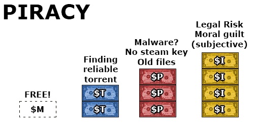 It's free, but if I'm being honest I find it faster & easier to buy a game on Steam or GOG these days than to try to find a good torrent and navigate the shady world of malware-infested sites to bother with piracy. And often pirated games are outdated or lack a convenient update mechanism. (Of course, veteran pirates can probably smooth the $T and $P costs down through practice). The biggest $P cost of piracy these days is you don't get a real steam key! What's funny about this is that a lot of modern players don't just want to play the game, they want it officially in their Steam account (or GOG, etc), with achievements and everything. Depending on the game you might also be forgoing multiplayer and other features. And of course, Piracy is "wrong." It's also technically illegal. Some people don't care about this, but as I argued in the original article, enough people care about $T, $P, and $I, that lowering those costs is enough to tip them over the edge and give you their $M for a legit copy.