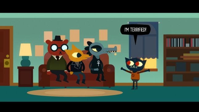 In the universe of unique visual styles, Night in the Woods certainly deserves more than its share of praise. Animator Scott Benson’s sensibility has made for uniquely beautiful cartoons that have a dark edge to them, and Night in the Woods is a triumph in part because of this.