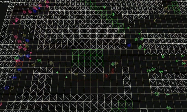 When this prototype was up and running with really simple debug rendering and spheres for each guest, we needed to test the CPU and memory performance to see if this technique was viable at the scale we were aiming for. We built a stress test map with the same dimensions as the target map size. This map had a few hundred goals and about 10,000 agents on it. While memory usage was a little bit over budget, we were confident that eventually we could drastically reduce it. The CPU usage was heavy but the system was single-threaded at this point. We already had a vision to parallelize the simulation so that it wouldn’t be a limiting factor.