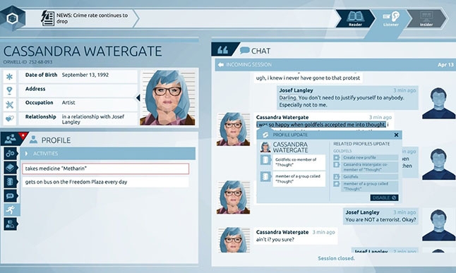 On a basic level, Orwell is a mostly text-based narrative game that constantly confronts players with choices of varying moral weight. Unlike a typical interactive novel Orwell does not present players with an explicit decision between a set of juxtaposed options (multiple choice) on how to continue the story or which action to take next. Instead it gives players separate pieces of data (we call them “datachunks”) that appear in documents they have found, which contain information they may add to a suspect’s profile.