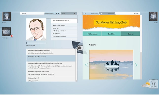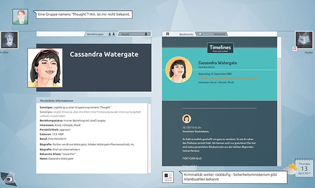 This, however, posed new problems in itself: players would now always have to get tasked with what to look for, giving away to a degree the surprise of what would be coming up – a minor logic issue, but a major dramaturgic one. Even more so, test players reported the game felt extremely linear with no choice at all, despite actually having multiple options to solve a task. Players simply never became aware whenever there was a second solution for a task, and how could they without any hint? Consequently, Orwell was now a game about searching for answers, but not one about choice. We had to iterate the core game mechanic once again.