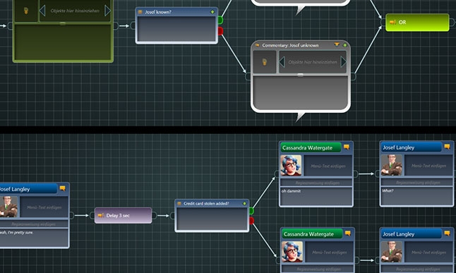 Figure 5: A screenshot of Articy:Draft 2, the tool we used for level design and scripting. In the top image you can see the inner workings of the “credit card stolen” datachunk: Adding this one will result in short-term feedback (branching comments, white nodes) based on another info the player might have added before. The bottom image depicts a later consequence of having added the “credit card stolen” datachunk, causing a different dialogue branch to be selected.