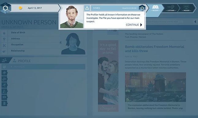 We came up with the idea of the “adviser.” The adviser is a character who comments on the information the player gives away, and therefore is the central element to provide feedback in Orwell. On a very basic level the adviser makes statements about what has just been uploaded, a line of text to let players know the new information they found has been noted. But his true role goes far beyond that: